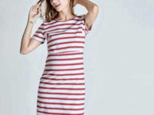 Cette robe de grossesse style casual est disponible en rayures rouges, bleues, noires ou grises.