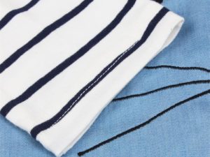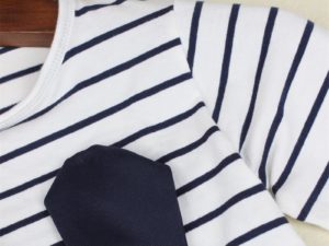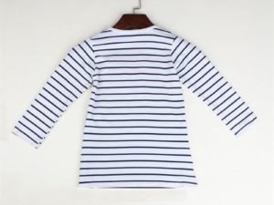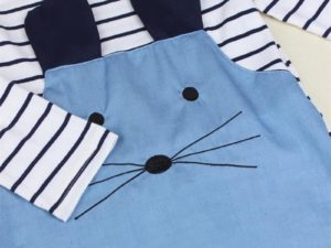 Le haut de la robe est blanc avec des rayures bleues (marinière). La partie inférieure de la robe représente une souris mignonne.