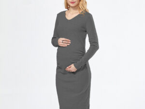 Superbe robe longue, légèrement moulante, pour femme enceinte (et après l’accouchement). La robe arrive jusqu’aux mollets. Elle a un large col V.